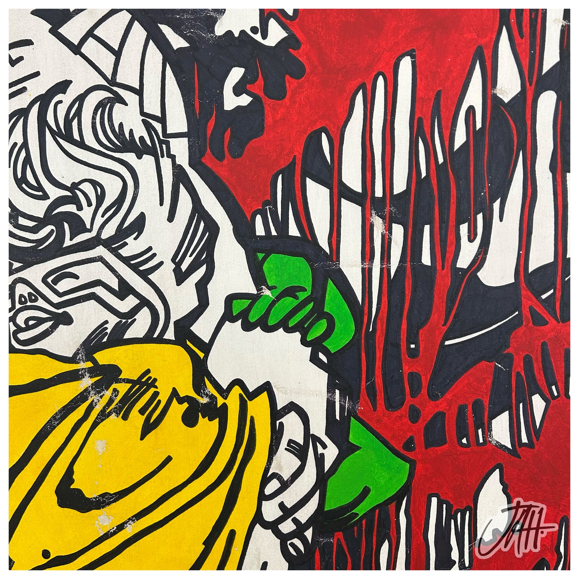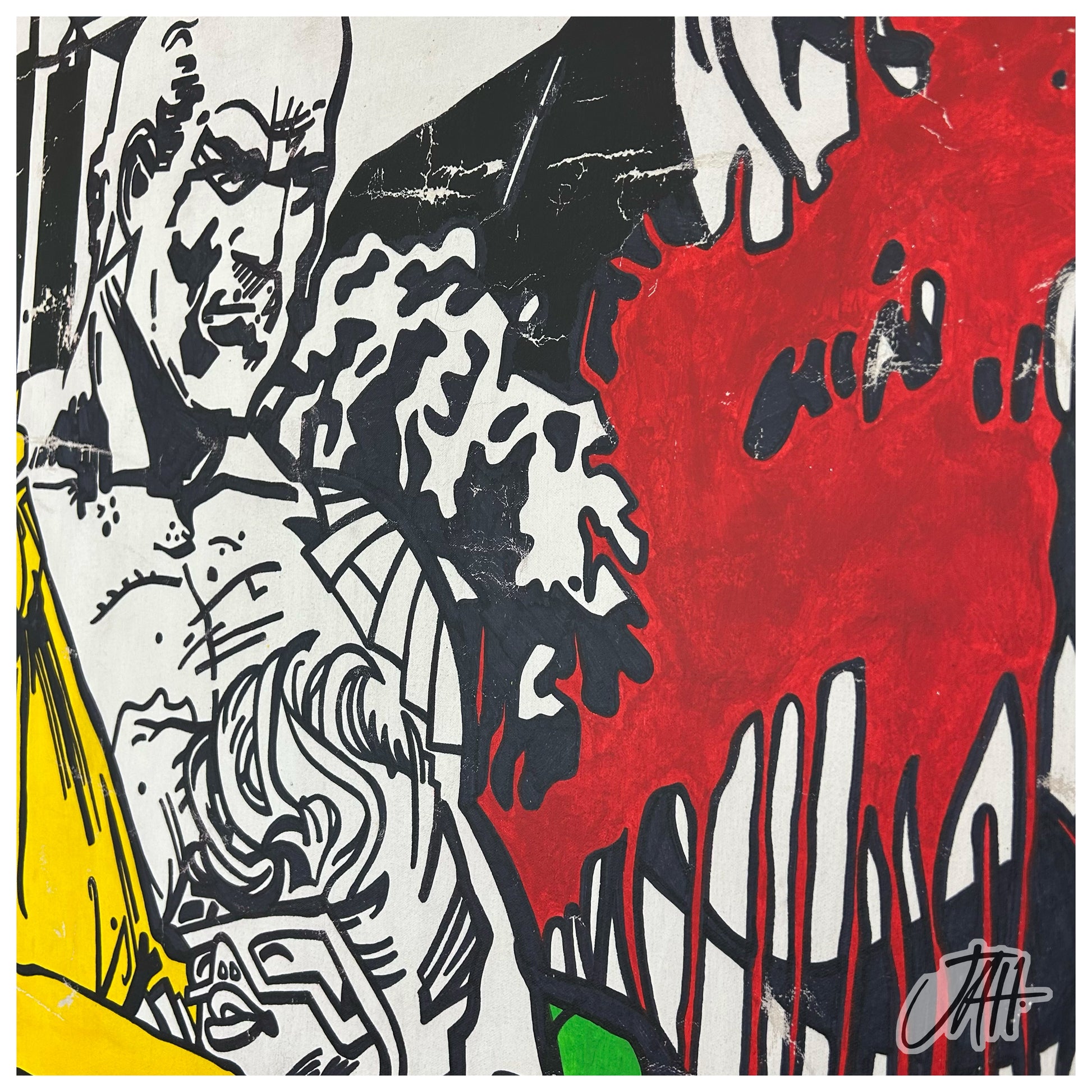 I've gone for a kind of film noir approach with just a few highlights of basic colours and let the heavy lifting of the work be done by the strong black lines. The distressed canvas gives a real retro comic page vibe.