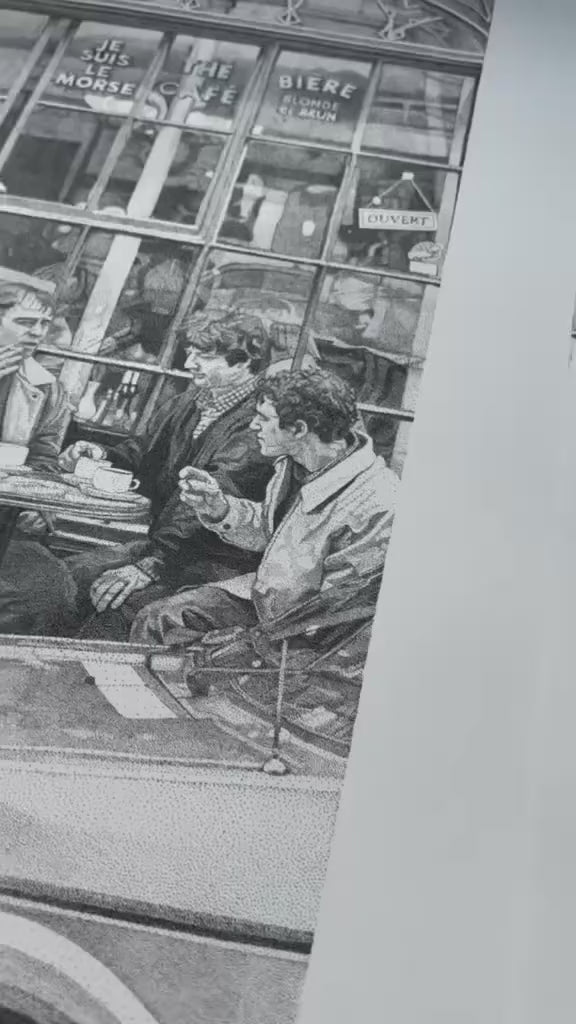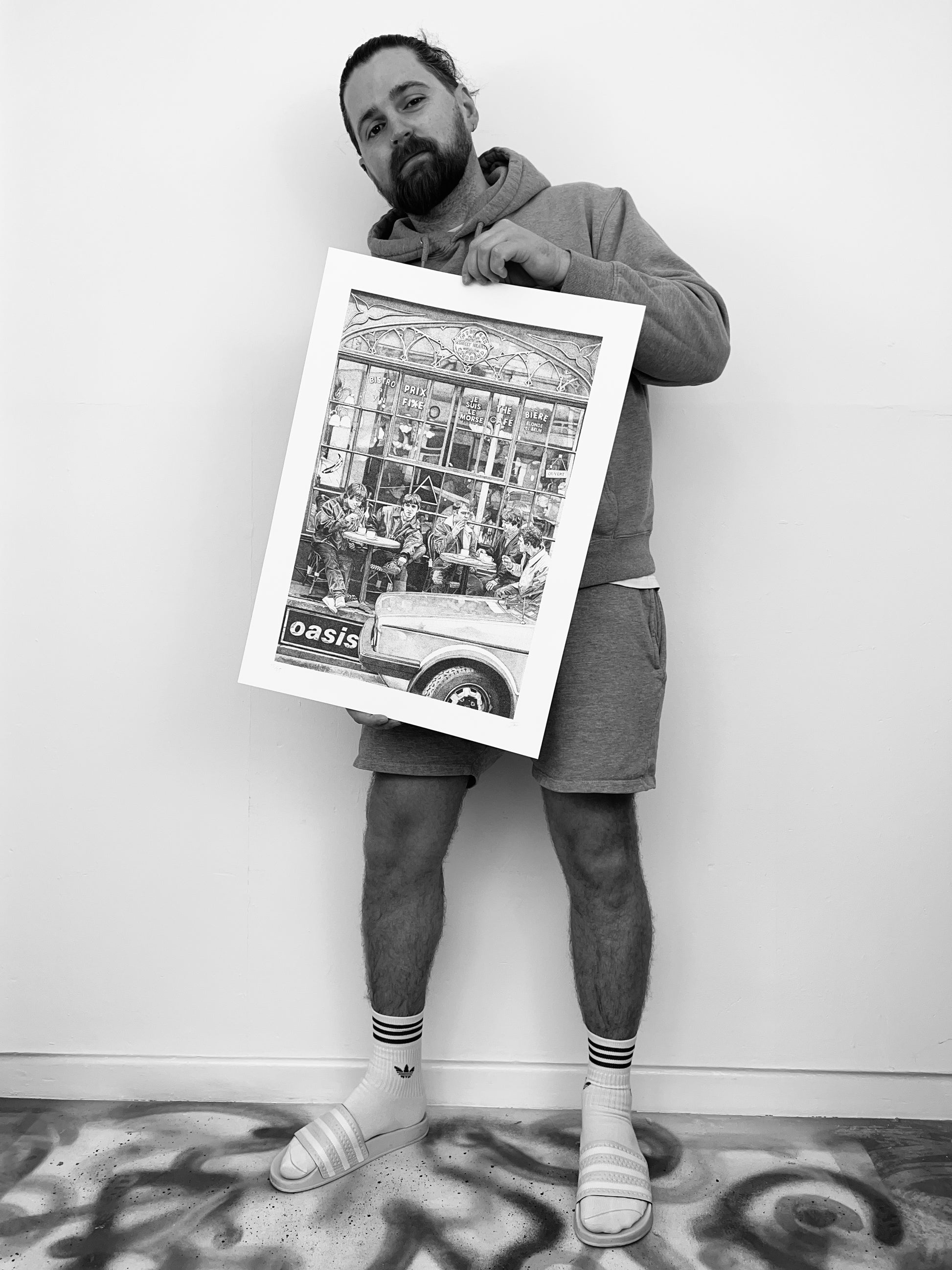 This A2 pointillist pen drawing of Oasis having a cuppa outside a cafe took me bloody ages to finish so I decided to make prints.